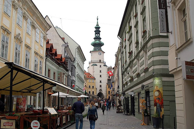 Vamos a entrar al casco viejo por la puerta-torre de San Miguel, Michalska Brana, de las 4 puertas que había es la única puerta de entrada a la ciudad amurallada que queda, tiene planta cuadrada y más tarde se le añadió un cuerpo octogonal en la parte superior.